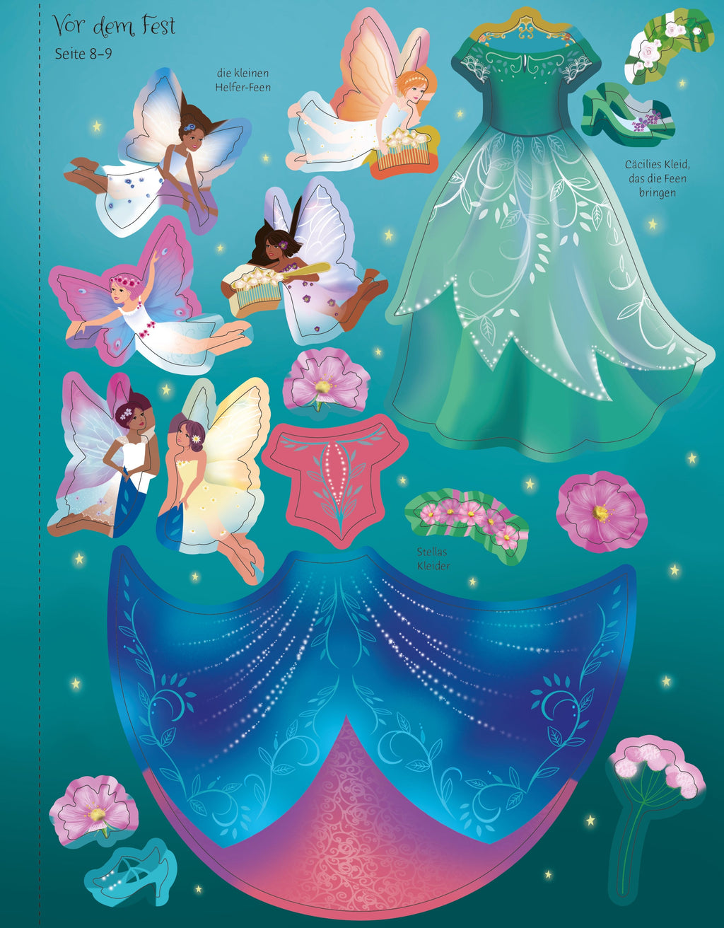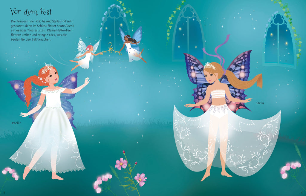 Die graziösen Feen-Prinzessinnen spielen Verstecken im Herbstwald, pflücken Blumen im Rosengarten und streicheln magische Einhörner im Mondschein. Mit über 300 Stickern - davon viele mit Glitzer - kannst du sie für jeden Anlass in feine Kleider hüllen.