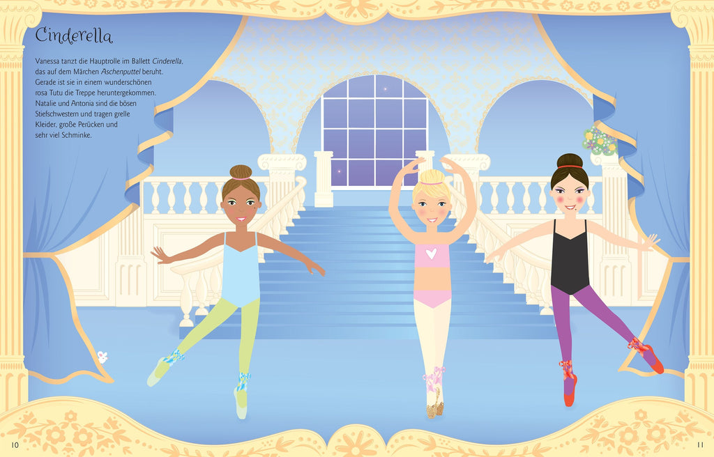 Vorhang auf für Antonia, Natalie und Vanessa – drei Ballerinen, die zugleich beste Freundinnen sind. Mit über 400 Stickern – davon viele mit Glitzer – kannst du ihnen prachtvolle Kostüme für berühmte Ballettstücke wie Dornröschen, Der Nussknacker oder Schwanensee anziehen.