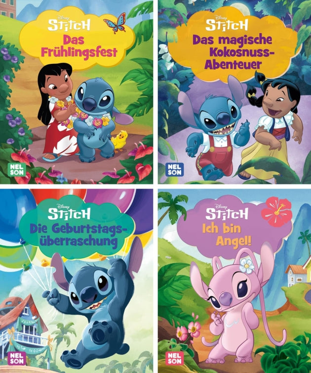 Vier neue Mini-Bücher mit Lilo, Stitch, Angel und ihren Freund*innen: Das Frühlingsfest, Das magische Kokosnuss-Abenteuer, Die Geburtstagsüberraschung, Ich bin Angel