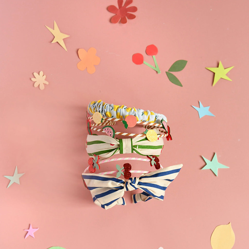 Unser gestreiftes Riviera-Stirnband ist aus weichstem, blau-neutral gestreiftem Stoff gefertigt, mit einer handgebundenen Schleife versehen und so gestaltet, dass es kleinen Köpfen bequem passt!