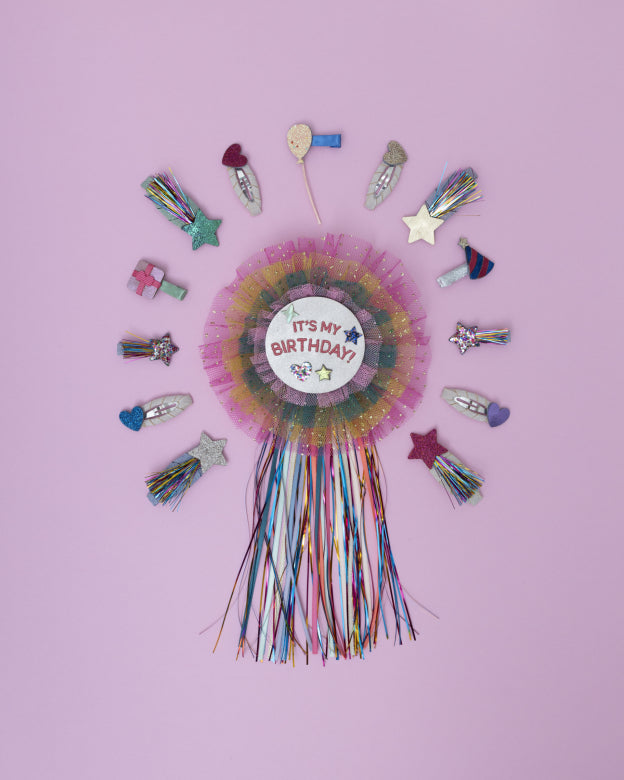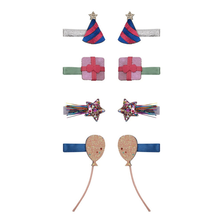 Feier stilvoll mit unseren Mini-Clips für Geburtstagsfeiern! Mit Partyhüten mit Sternen, Glitzerballons, Sternschnuppen und mit Bändern umwickelten Geschenken sorgen diese Clips für zusätzliche Freude bei jedem Geburtstagsoutfit!