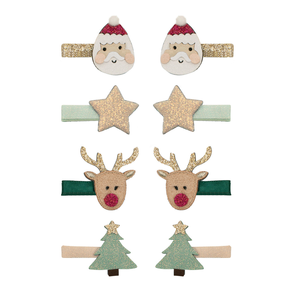 Entdecke die festliche Magie mit unserem charmanten Mini-Clip-Set – perfekt für kleine Weihnachtsfans! Dieses Set bringt den Weihnachtszauber ins Haar mit acht niedlichen Spangen im Weihnachtsdesign. Jeder 3 cm große Alligatorclip ist liebevoll mit Bandumwicklung versehen und zeigt fröhliche Motive wie den Weihnachtsmann, Rentiere, funkelnde Sterne und Tannenbäume. Die Kombination aus weichem Wildlederimitat, glitzerndem Glitter und metallischen Stoffen sorgt für einen wunderbar festlichen Look. Ein absolutes Must-have für die Weihnachtszeit!