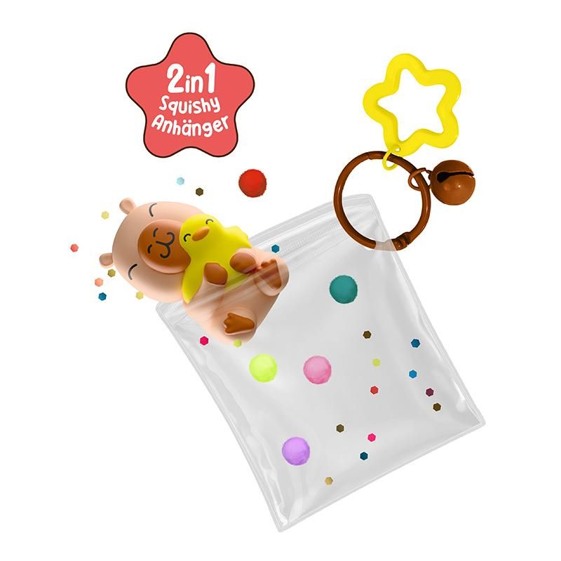 Dieses supersüße Squishy-Capybara ist perfekt zum Drücken & Knautschen - mit beruhigender Anti-Stress-Wirkung! Verpackt in einem hochwertigen Zip-Beutel mit effektvollem Konfetti & PomPoms und praktischem Schlüsselring mit süßem Sternanhänger und kleinem Glöckchen. Größe Capybara: ca. 2,4 x 1,5 x 4,0 cm