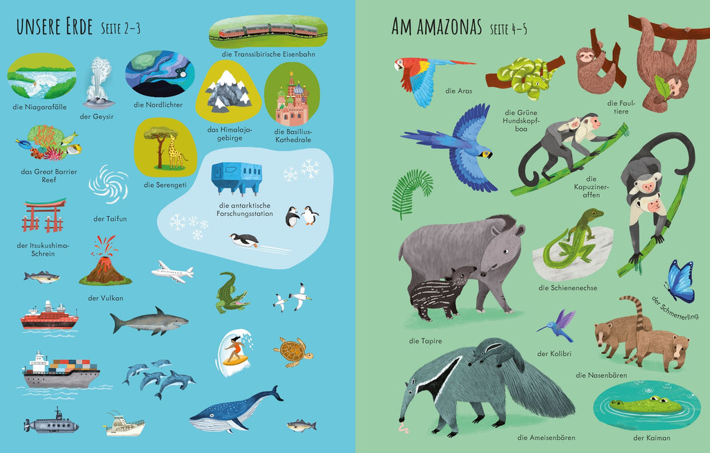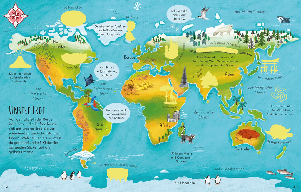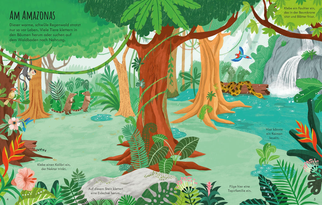 Reise um die Welt und gestalte die interessantesten Orte der Erde mit über 150 Stickern. Ob Niagarafälle in Nordamerika, Tapire im Amazonas oder mutige Forscher in Tropfsteinhöhlen - hier lernst du mehr über unseren faszinierenden Planeten!