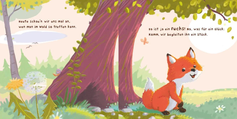 Nanu! Der kleine Fuchs begegnet einem Frischling, der Frischling lernt ein Eichhörnchen kennen – und wen wird das Eichhörnchen wohl noch treffen? Komm mit und begleite die Tierkinder bei ihrer vergnüglichen Kennenlernreise! Ein erstes Bilderbuch für Kinder ab 1 Jahr.