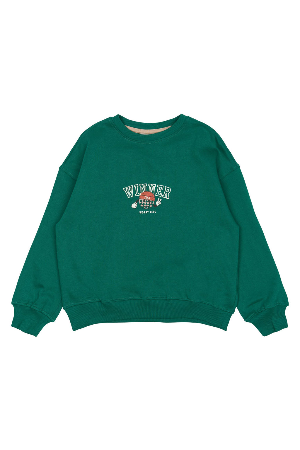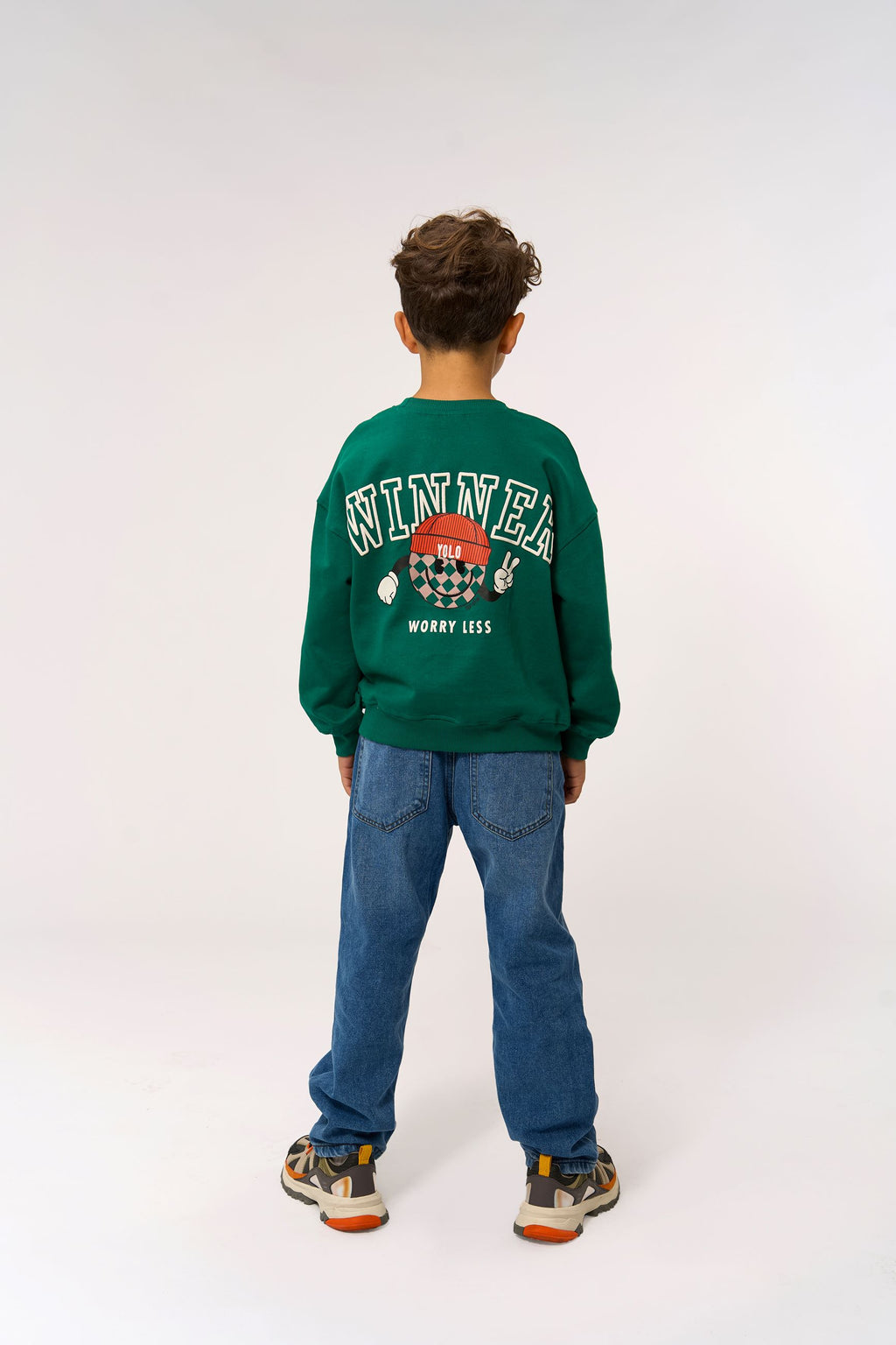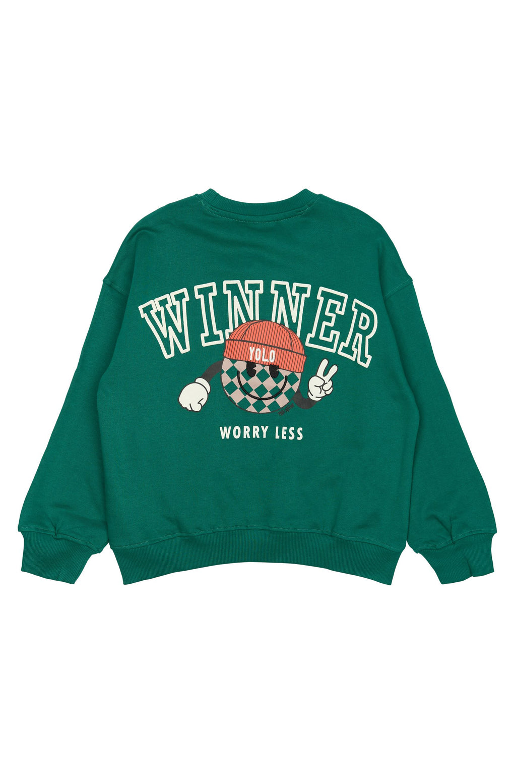 Oversized-Sweatshirt von THE NEW mit verspieltem und einzigartigem Design. Auf der Vorderseite befindet sich eine Brusttasche mit einem Smiley, der ein Peace-Zeichen macht und eine Kappe mit dem Schriftzug „YOLO” trägt. Über der Tasche steht der Schriftzug „Winner”. Auf der Rückseite befindet sich eine vergrößerte Version des Smiley-Prints zusammen mit dem Schriftzug „worry less”, der für eine entspannte und positive Stimmung sorgt. Perfekt für den Alltag und lustige Anlässe.